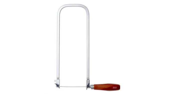Figuurzaagbeugel vervaardigd van plat, verzinkt staal. Beukenhouten handgreep, oranje gelakt. Compleet met figuurzaagblad voor hout: 300 mm / 12″