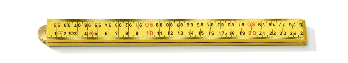 Timmermansduimstok van ABS plastic met een metrische schaal in het zwart met decimalen in het rood. Dit klassiek Nederlandse model vouwt uit in vier delen.