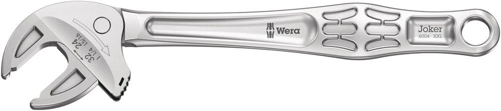 Veel gebruikers zouden graag willen beschikken over een universeel gereedschap dat voor zoveel mogelijk zaken te gebruiken is. Eén stuk gereedschap voor meerdere metrische en duimse maten. En dit zou zich dan ook nog eens automatisch aan de verschillende schroefmaten moeten aanpassen. Veilig vastgrijpen, niets beschadigen en een hoge werksnelheid mogelijk maken. Middels traploos parallel lopende bekken worden meerdere steeksleutelformaten vervangen. De vereiste maat wordt automatisch bij het aanzetten op de zeskant-moer en schroef ingesteld. Het geïntegreerde hefboommechanisme klemt de zeskant-schroef resp. moer tussen de bekken veilig in, hetgeen het risico op wegglijden en beschadigingen aanzienlijk verkleint. De ratelfunctie maak snel en soepel schroeven zonder telkens het gereedschap te moeten verplaatsen mogelijk. Door toepassing van hoekprisma’s wordt een terughaalhoek van slechts 30° gerealiseerd. De 1-zijde-constructie in combinatie met de ratelfunctie en het hoekprisma maakt werken in krappe ruimtes mogelijk. De instelbare Joker 6004 is een echt universeel schroefgereedschap. Zelfinstellend. Vastgrijpend. Ratelend.